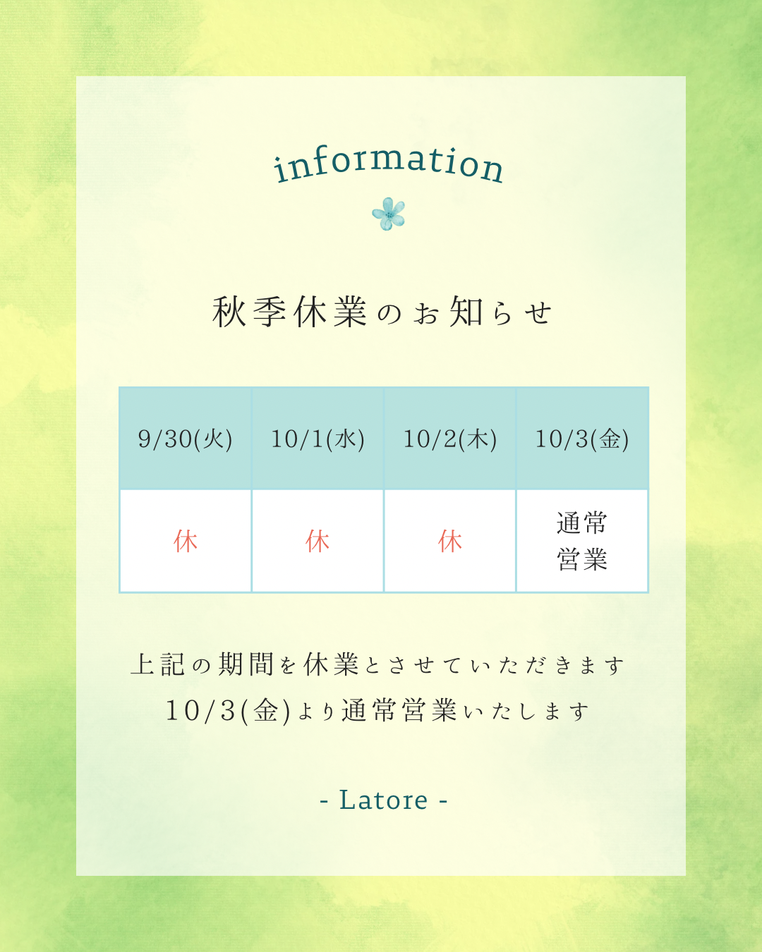 秋季休業のお知らせ